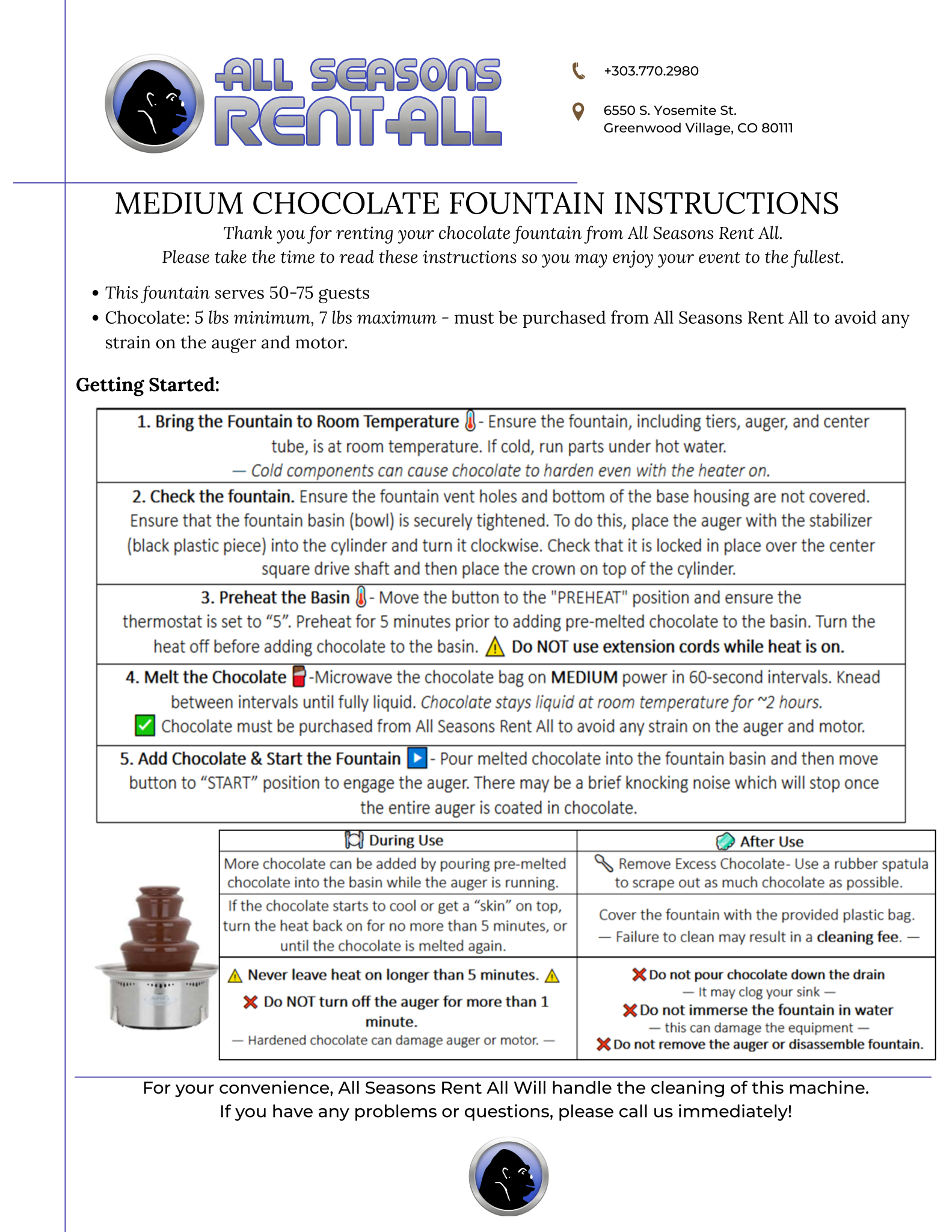 The fountain is rented as a standalone item. Chocolate is sold separately and must be purchased from All Seasons Rent All to ensure proper performance. Our team is available to answer questions before your event so you can plan with confidence.