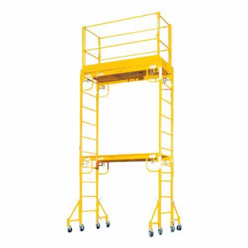 This scaffold has a standing platform of 6′ x 30″. It has a max standing height of 6′ per section, adjustable at 2.5″ increments. Up to two sections can be stacked to give a max platform height of 12′. This can be used on stairways, but the stairway must be at least 32″ wide. On stairs, it gives a standing platform of 6′ tall per section measured from the lowest stair. Above all we want you to be safe. Therefore casters, safety rails, and outriggers are available for no additional charge. This scaffold is for indoor use only.